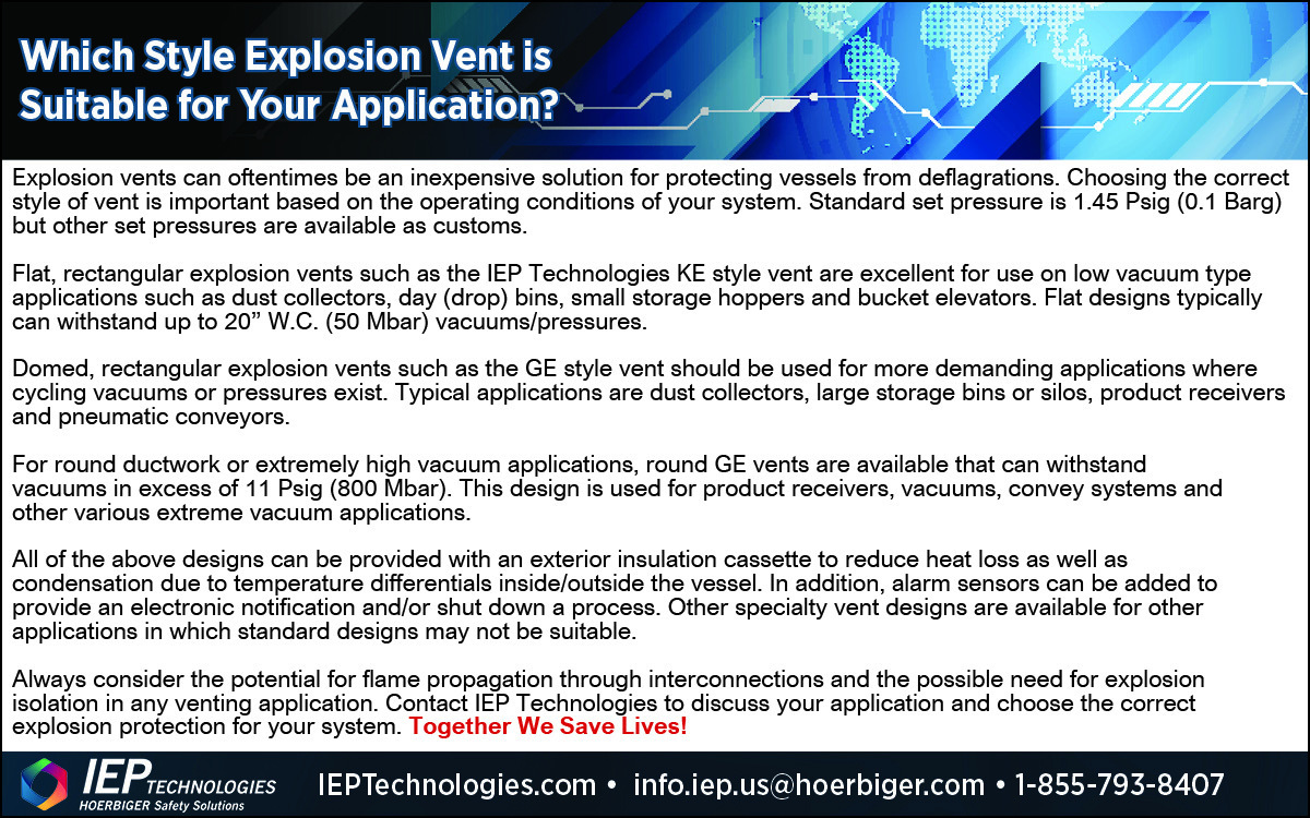 Always consider the potential for flame propagation through interconnections and the possible need for explosion isolation in any venting application. Contact IEP Technologies to discuss your application and choose the correct explosion protection for your system. Together We Save Lives!